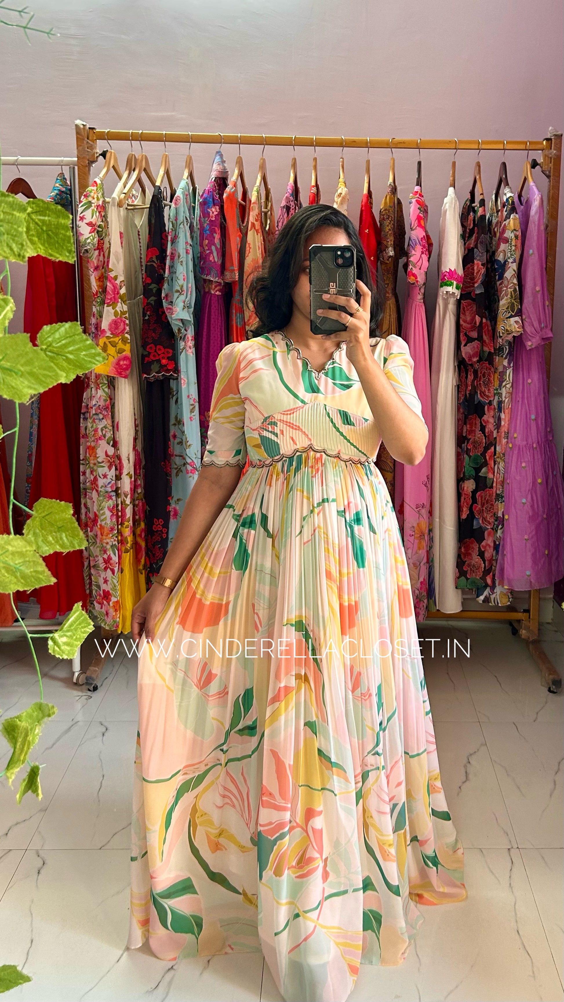 A dreamy pastel floral maxi dress crafted with soft pleated detailing and gentle scallop edges.