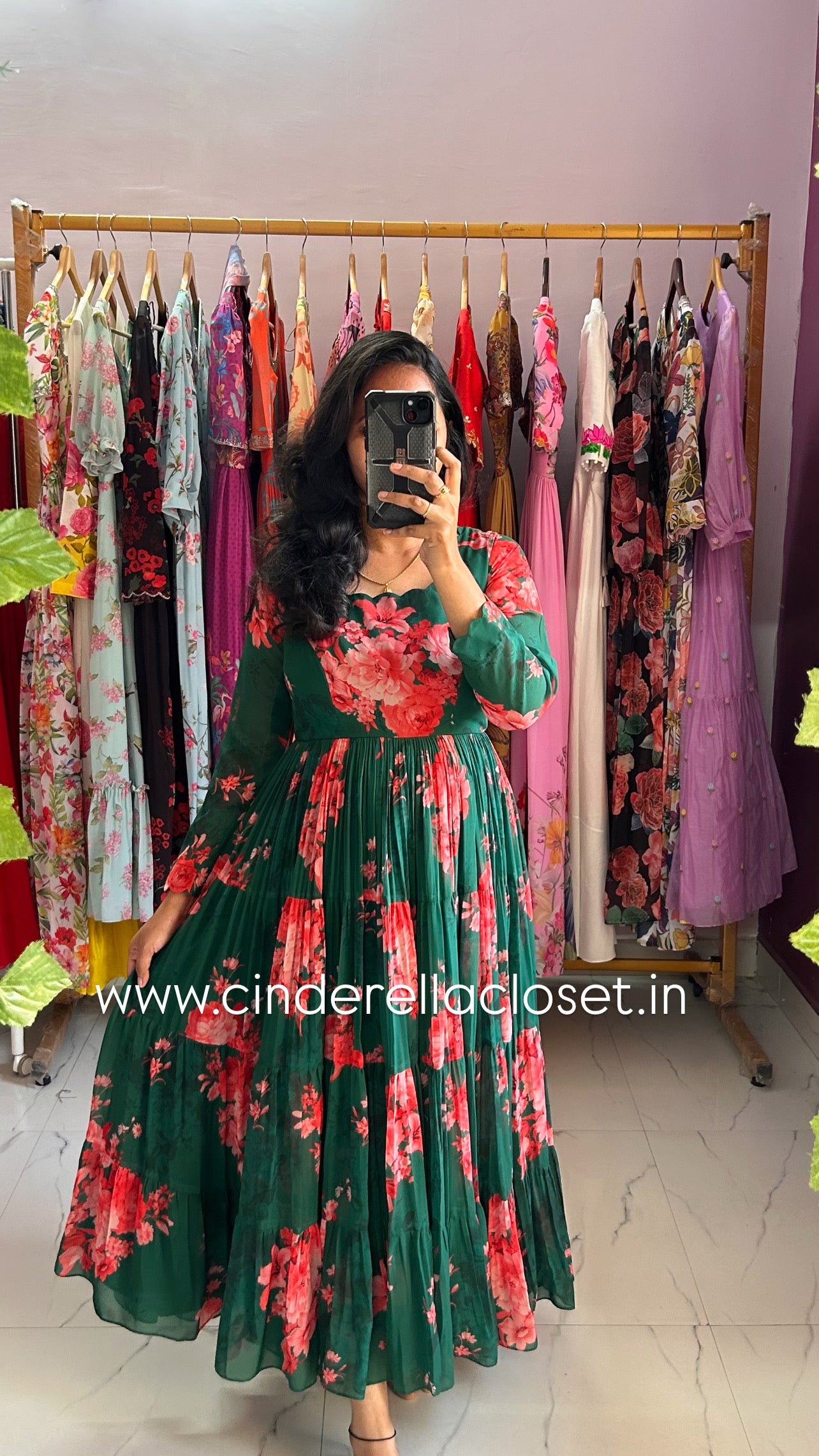 Designed to make you feel effortlessly graceful, this dress features a rich emerald canvas adorned with soft, romantic floral prints. The pleated flare adds volume and movement, making every step look dreamy. Crafted from breathable, flowy fabric, it ensures all-day comfort with a premium finish.