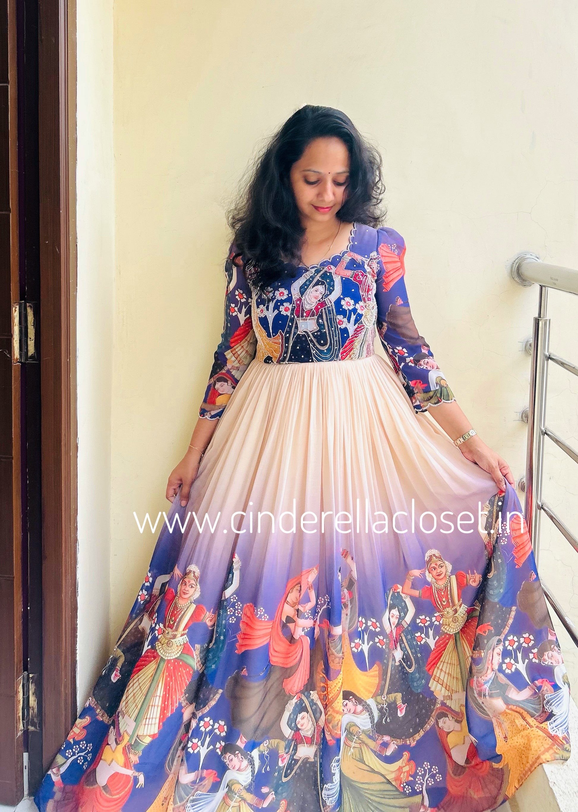 This gorgeous anarkali gown features vibrant dancing doll prints inspired by Indian folk dance traditions. With soft pleated flair and premium finishing, this outfit brings culture and comfort together beautifully.