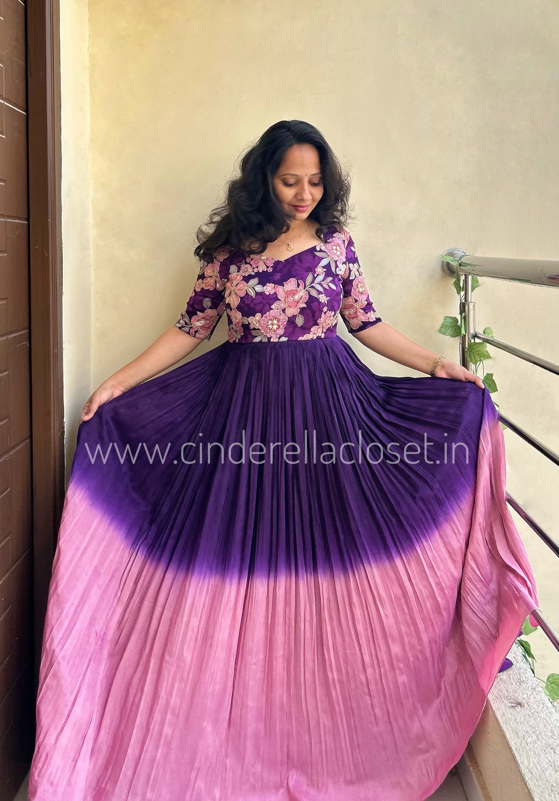 Step into elegance with our Lavender Bloom Ombre Gown featuring a floral embroidered bodice and a soft pleated ombré flare in rich purple fading into baby pink. Lightweight, flowy and perfect for parties, maternity shoots, festive wear, or special occasions. Designed for comfort and a stunning twirl-worthy silhouette.