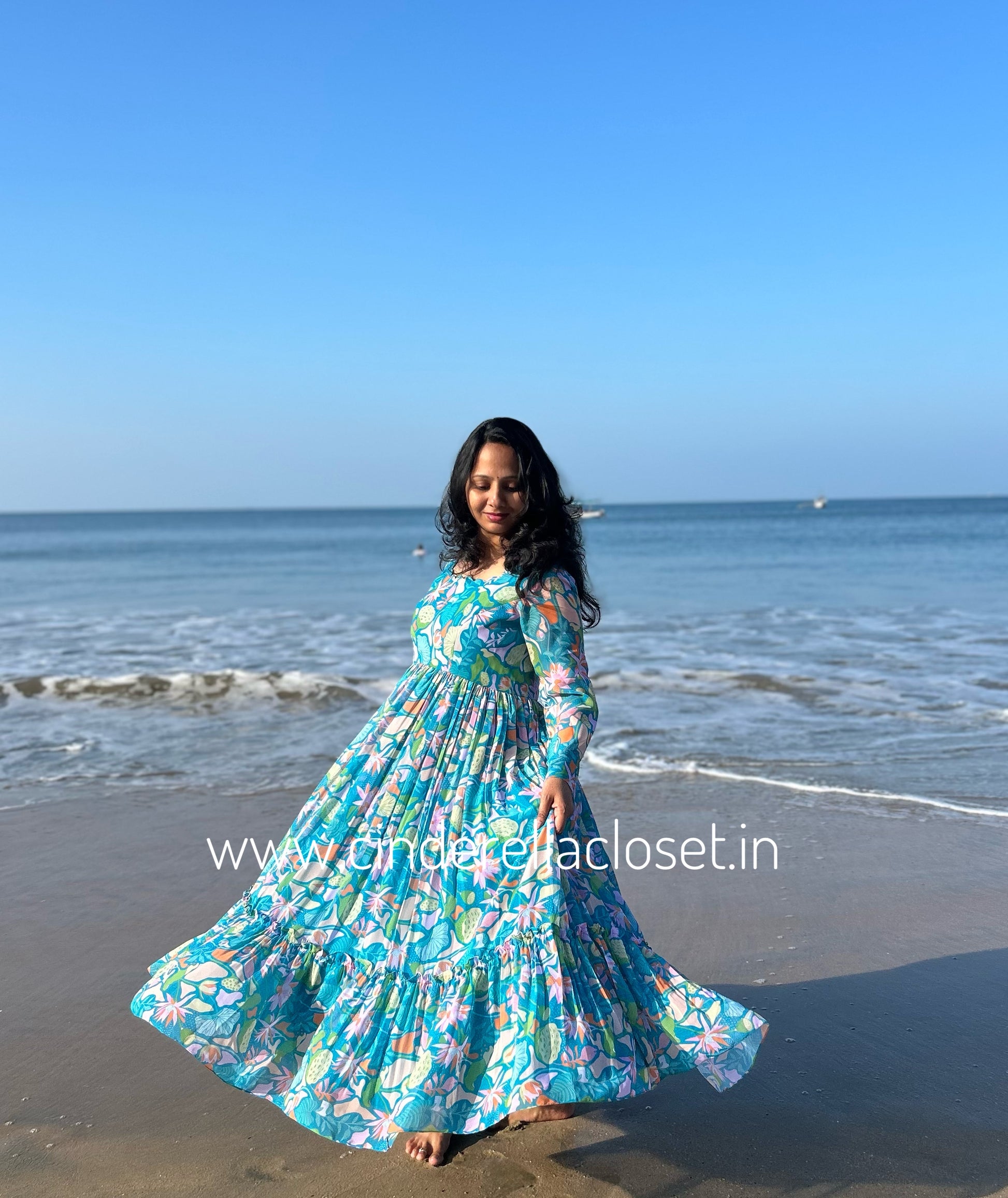 Step into effortless elegance with our beautiful frock, designed for comfort and graceful movement. Crafted in a soft, breathable fabric, this dress features a refreshing floral print inspired by tropical blooms and ocean hues. The gathered waist and tiered flare create a flattering silhouette, while the full sleeves add a touch of sophistication. Perfect for beach outings, vacations, brunches, or casual celebrations.