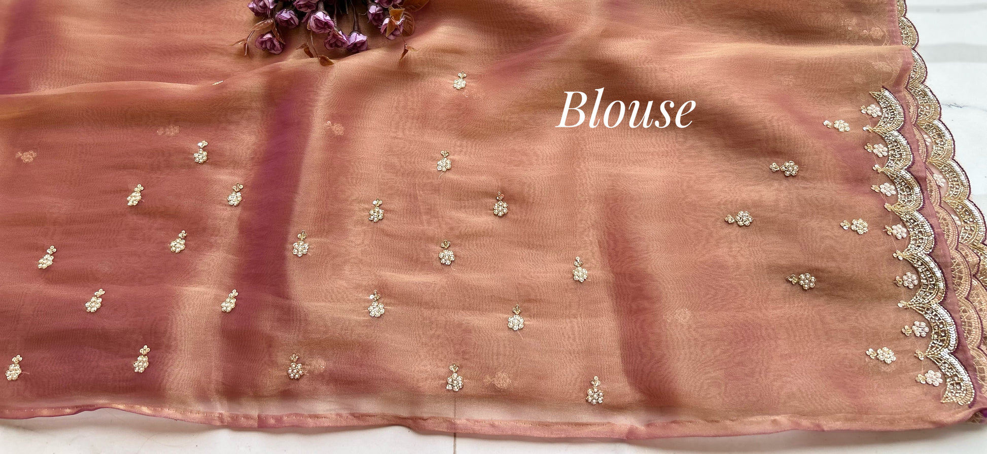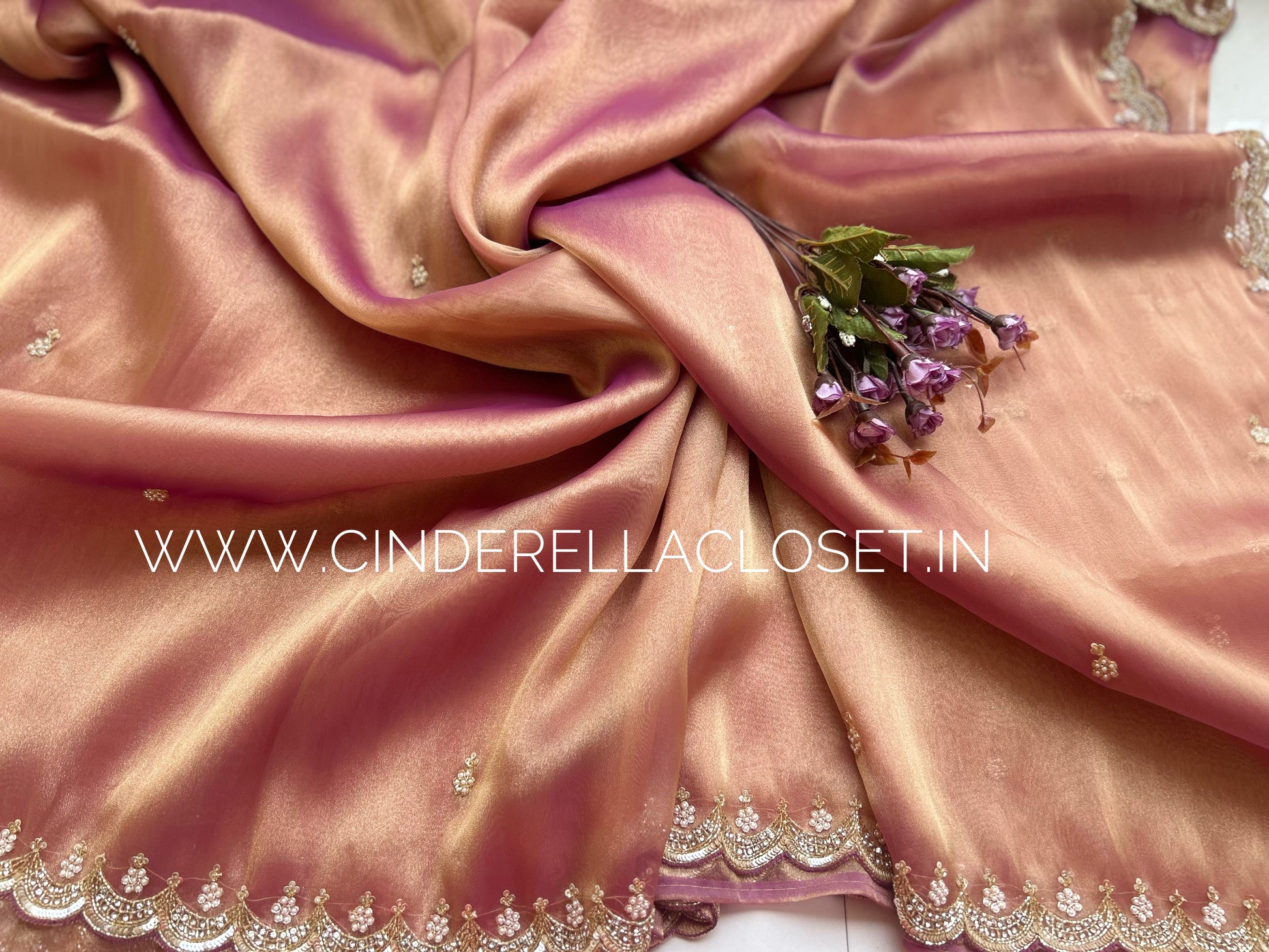 Elevate your festive wardrobe with this stunning tissue saree crafted in a gorgeous peach-pink dual tone. The saree features a natural shimmer, adding an elegant glow to your look. Tiny stone buttis are scattered throughout for a subtle sparkle, while the scalloped embellished border gives it a refined, designer finish. Perfect for weddings, receptions, and special celebrations.